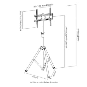 ALTURA (medida aproximada do piso ao centro do televisor) Altura mínima da TV: 80cm (do chão ao centro da tela / base de monitor). Altura máxima da TV: 145cm (do chão ao centro da tela / base de monitor).