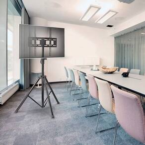 O tripé para TV da Central Suportes proporciona melhor aproveitamento do espaço e é perfeito para ambientes corporativos, eventos e feiras.