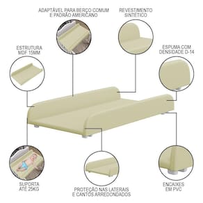 O Trocador para Berço é um produto que se adapta ao berço, seja ele simples ou padrão americano. Ele tem encaixes de PVC que permitem que ele seja apoiado sobre as grades do berço, sem precisar de parafusos ou ferramentas. Assim, você pode colocar e tirar o suporte sempre que quiser, sem danificar o seu móvel. O Trocador é feito de madeira 100% MDF, com chapa de 15mm, estofamento de espuma D-14 e revestimento sintético. Isso significa que ele é resistente, durável, fácil de limpar e muito confortável para o seu bebê. Além disso, ele tem um design moderno e elegante, que combina com qualquer decoração. Com o suporte você vai otimizar o espaço no Quarto Do Bebê e ter mais praticidade no dia a dia. E o melhor de tudo: você vai proporcionar mais conforto e agilidade ao seu bebê, que vai se sentir mais acolhido e tranquilo.