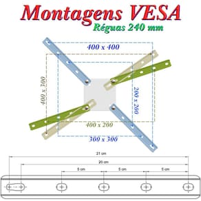 - A montagem versátil das réguas prolongadores ajustam-se perfeitamente a furação VESA do gabinete da TV, não deixando pontas desnecessárias e deselegantes.