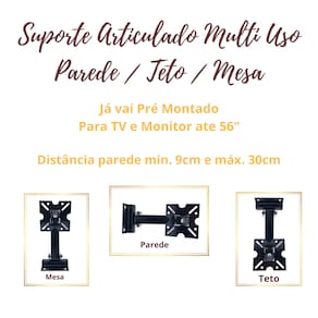 Ele possui diversas aplicações, é um suporte multiuso três em um, pode ser utilizado na parede, no teto ou na mesa, conta com duas articulações horizontais e uma inclinação vertical, totalizando três movimentos, assim a Tv pode ficar com ângulos diferentes.