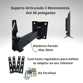 O suporte articulado é ideal pra poupar espaço no local e é importante não só para a decoração do ambiente, como também para dar mais flexibilidade para a TV. Ideal para fixar seu aparelho de maneira fácil, eficaz e segura, em qualquer ambiente de sua casa ou estabelecimento.