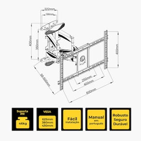 Características Técnicas: - Compatível com TVs de 32 a 86 polegadas (LED, LCD, Plasma); - Suporta até 46kg; - Padrão VESA Compliance: 595mm/290mm/465mm; - Movimento completo com ajuste de inclinação; - Instalação no teto ou parede: ideal para ambientes com pouco espaço; - Sistema de organização de cabos com capa embutida.