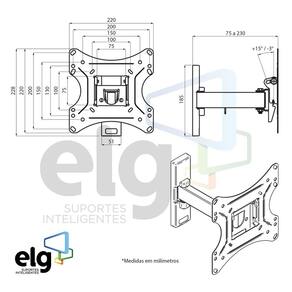 Seja Bem Vindo a DD Máquinas!Suporte articulado de parede compatível com TVs de 15" a 43" que apresentem peso máximo de 30kg e padrão de furação VESA 75x75, VESA 100x100, VESA 200x100 ou VESA 200x200mm (HxV).Possui afastamento mínimo da parede de 7,5 cm e afastamento máximo de 23 cm. O suporte apresenta movimento de giro horizontal de até 90° (limitado ao tamanho da TV), inclinação vertical de -3° a +15° e ajuste lateral de +3° a -3°.O produto já vem montado de fábrica e possui instalação simples e intuitiva em apenas 3 passos. Praticidade no dia-a-dia e integração entre ambientes.Informações:Movimentos leves e precisos para melhor posicionamento da TVOrganizador de cabosAcabamentos plásticos para cobrir os parafusos e a base de fixação na paredeIncluso parafuso extra longo M8x50 para modelos de TV Samsung que requere o uso deste parafusoCaracterísticas:Carga Max(KG): 30kgCor: pretoDistância TV: 7,5cm a 23cmFabricação: aço carbonoGiro Horizontal: 90° (limitado ao tamanho da TV)Inclinação Horizontal: +3° /-3°Inclinação Vertical: -3° / +15°Padrão VESA: 75x75 a 200x200Pintura: epóxi eletrostáticaPolegadas: 15'' a 43''Tipo:articuladoTipo TV: LED / PLASMA / LCDTratamento Supeficial: anticorrosãoGarantia:Tempo de Garantia : 36 mesesAntes de instalar leia o Manual de Instruções que acompanha na caixaA Garantia ELG é limitada a defeitos de fabricação do produto adquirido, não cobrindo danos por erros de instalação e uso*Imagens Meramente Ilustrativas.Todas as Informações divulgadas são de responsabilidade do Fabricante/Fornecedor.Tome cuidado ao manusear e utilizar o aparelho.