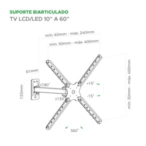 - Compatível com TVs e monitores de 10 a 60 - Capacidade de carga: até 30kg - Material: Aço carbono de alta durabilidade - Ajustes: Inclinação de 15, rotação de 360 e articulação de 130 - Distância da parede: Mínima de 6,3cm e máxima de 24cm - Compatível com padrão VESA: 50x50 até 400x400