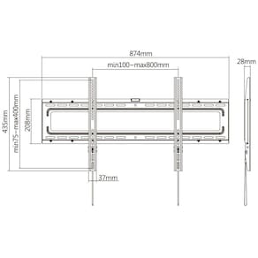 Indicado para TVs / Monitores LCD / LED / OLED / QLED / PLASMA / 3D a partir de 43 polegadas com até 75 kg e compatíveis com padrão de fixação VESA 100x100, 200x100, 200x200, 200x300, 300x200, 300x300, 400x200, 400x300, 400x400, 600x200, 600x400, 800x200, 800x400 ou 800x600 mm HxV , normalmente encontrado em televisores de 43 a 89 polegadas.