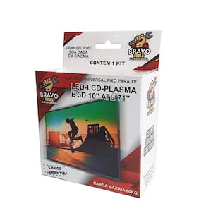 - Marca: Bravo Tools - Modelo: SF0004 - Suporte universal fixo - Para TVs de LED, Plasma, 3D, de 10 até 71 Polegadas - Acompanha parafusos que atendem a maioria dos modelos de TV existentes no mercado - Este suporte deixa uma pequena distância entre a parede e sua TV. Fácil e rápido de instalar, possui uma praticidade elevada e integração total com o ambiente. - Uma das maiores vantagens desse modelo de suporte para TV é a liberação de espaço no Rack ou estante da sua sala, deixando livre para decoração e design de interiores moderno para seu ambiente. - Os suportes fixos na parede são simples para instalar, mas observe a qualidade e marca do produto. Suportar o peso de sua TV, dando um bom acabamento e nivelamento é essencial. - Acompanha manual para instalação - Carga Máxima: 60 Kg - Garantia: 5 Anos Marca: Bravo Tools Ean: 7898705870119