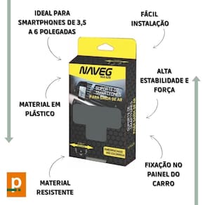 Suporte veicular para celular naveg nva 620-1 Informações do produto O suporte veicular para celular naveg: Tudo o que seu carro precisa, prático, este suporte é indicado para você colocar o seu smartphone preso no painel. De fácil manuseio. Seu aparelho pode ficar carregando e você ainda mexer confortavelmente na tela. Só não faça isso enquanto dirige. Ideal para verificar a rota de viagem no mapa. Ver quem está ligando, dar mais uma carga antes que a bateria acabe. Indicado para aparelhos com tela de 3.5 a 6 polegadas Características - alta estabilidade e força. - projetado para e smartphones de 3,5 a 6 polegadas. - suporte veicular para celular - para fixação no painel do carro Especificações técnicas: Produto: novo Marca: naveg Modelo: suporte veicular de celular Tipo: profissional Material: plástico Cor: cinza com preto : 3 meses Aplicações O suporte veicular de celular naveg é ideal para: Você poder dirigir com segurança, tendo a sua frente o seu aparelho bem fixo e visível, para acompanhar as rotas de gps, ou até mesmo deixá-lo carregando de uma forma segura enquanto efetua sua viagem. 2-Tem Sim. de 3 meses. 5-Vende em maior quantidade Sim. Temos outros anúncios 6-Ele é resistente Sim. Produto de ótima qualidade. 7-Serve para 11 Sim. Todos celulares de 3,5 a 6 polegadas 8-Ele vem em caixa Sim. Embalado individualmente em caixa. 9-A fixação é boa Sim. Ele fica bem fixo na saída de ar. 10-A é por conta de quem Nossa empresa garante os produtos e caso necessite damos total assistência. Marca: Não Informado Ean: 7800837062829