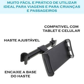Suporte Veicular Para Encosto De Cabeça Banco CelularQue tal utilizar seu tablet ou smartphone como um monitor no seu carro É a eficiência e a praticidade que você mereceO suporte de celular/tablet é prático e fácil de usar, suas hastes são ajustáveis proporcionando um encaixe perfeito e seguro.Para instalar, basta encaixar o suporte entre as extremidades do encosto do banco e pronto agora é só encaixar seu celular ou tablet.É ideal para entretenimento de crianças e adultos durante as viagensEle permite o ajuste perfeito na hora de descontrair as crianças ou qualquer passageiro em suas viagens.Além do mais, o suporte proporciona a segurança de manter o aparelho bem encaixado para não correr o risco de queda e prejuízo.