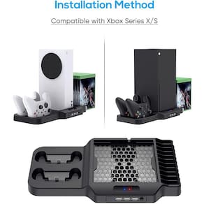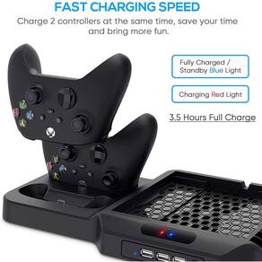 Suporte vertical com ventoinha de arrefecimento compatível com a estação de carregamento Xbox Series XS YUANHOT com portas de carregador de comando duplo Sistema de armazenamento e arrefecimento de jogos Design tudo-em-um: Mantenha a consola, os comandos sem fios e os jogos organizados; Além disso, ele carrega os controles e dissipa o calor para a compatibilidade do console: o suporte vertical é compatível com o console Xbox Series X/S. Um presente ideal para os entusiastas de jogos (Nota: console, controladores e jogos não estão incluídos) Sistema de Resfriamento: Built-in 2 ventiladores de resfriamento de alta velocidade, alta eficiência e design de baixo ruído. Não há necessidade de se preocupar com o superaquecimento do console. Mantém a funcionalidade funcional e melhora a vida operacional Carregador de Controlador Duplo com Indicadores LED - Carregue até 2 controladores simultaneamente ou simplesmente armazene quando não estiver em uso. Com o indicador LED, saiba o estado de carregamento de relance. Facilita o carregamento dos seus comandos, poupando tempo e mantendo-os arrumados Design de poupança de espaço: o suporte minimiza o espaço ocupado pelos acessórios, mantendo-os numa posição vertical e mantém a sua área de jogo arrumada Suporte vertical com ventoinha de arrefecimento compatível com Xbox Series X/S, YUANHOT Charging Station com portas de carregador de comando duplo, Sistema de Armazenamento e Resfriamento de Jogos Carregue até 2 controladores simultaneamente ou simplesmente armazene-os quando não estiverem em uso. Com o indicador LED, saiba o estado de carregamento de relance. Facilite o carregamento dos controles Mantenha seu console Xbox Series X/S, controles sem fio e jogos organizados, economizando tempo e mantendo-os arrumados Equo com 3 portas USB estendidas, oferecendo mais opções