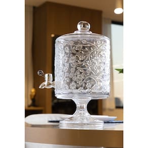 Com 4,5 litros, ela é ideal para sucos, águas aromatizadas, chás gelados e drinks. Produzida em cristal ecológico, destaca-se pelo brilho, resistência e design redondo com detalhes delicados que valorizam mesas de café da manhã, festas e recepções.