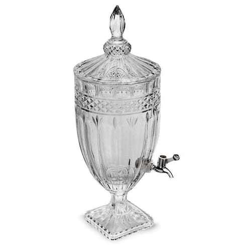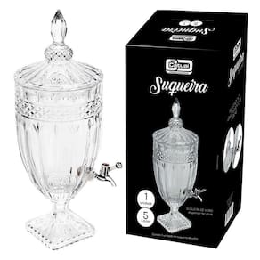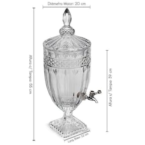 Suqueira de Vidro - 5 Litros - Ref. 3803 Leve mais charme e sofisticação à sua mesa com esta Suqueira. Produzida em vidro, comporta até 5 litros, possui torneira em Abs para dosar cada retirada de sua bebida favorita. Sua tampa superior facilita acrescentar gelo ou frutas, garantindo ainda mais sabor ao suco. Além de prática, a suqueira é ideal para decorar sua mesa de festa e eventos. Especificações: Altura com a tampa: 55 cm Altura sem a tampa: 39 cm Diâmetro maior: 20 cm Largura da base: 12 x 12 x 12 x 12 cm Capacidade: 5,0 Litros Peso aproximado embalada: 6,1kg Torneira: Cromada