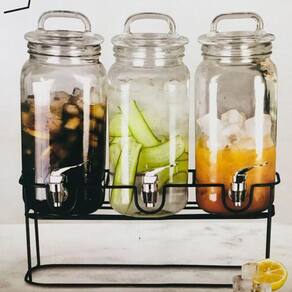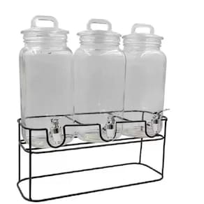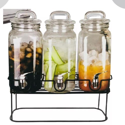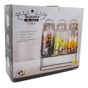 Suqueira de Vidro com Suporte de Metal 3pçs com 2.3l cada A Suqueira com Suporte de Metal com 3un tendo 2,3litros cada é um utensílio de mesa elegante e prático, perfeito para servir sucos, água saborizada, chá gelado e outras bebidas refrescantes em eventos e ocasiões especiais.Use sua criatividade colocando frutas e ervas coloridas para deixar a água saborizada surpreendendo todos seus convidados.Esta Suqueira tem capacidade para 6,9 litros de líquido, tem a tampa de vidro e a torneira de plastico cromado com gatilho rápido.A suqueira é fabricada em vidro de alta qualidade e tem um design moderno e sofisticado. A tampa e a torneira são feitas de plástico resistente e possuem uma vedação hermética, evitando vazamentos e mantendo a bebida fresca.O tamanho da suqueira com suporte é ideal para servir bebidas para um grande número de pessoas, tornando-a uma escolha perfeita para festas, churrascos, reuniões de família, eventos corporativos e outras ocasiões especiais.A limpeza da suqueira é fácil e simples, podendo ser lavada à mão ou na lava-louças. Com ela, você pode desfrutar de bebidas refrescantes com estilo e praticidade em qualquer evento ou ocasião especial. Informações técnicas do produto- Material: Vidro- Cor: Transparente- Marca: CIM- Capacidade: 2,3 litros cada- Dimensões Vidro: 11x11x28cm alturaSuporte: 37x12,5x7cm alturaVidro e Suporte: 35cm altura- Limpeza e cuidadosUse esponja macia e sabão neutro.Não limpe as peças com esponja áspera, palha de aço ou detergente abrasivo. Isso pode causar danos ao vidro. Ean: 7899800079872