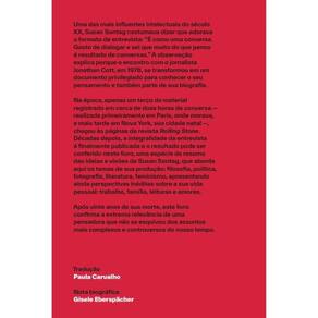 Uma das intelectuais mais influentes do século XX, Susan Sontag costumava dizer que adorava o formato de entrevista: “É como uma conversa. Gosto de dialogar e sei que muito do que penso é resultado de conversas.” A observação explica porque o encontro com o jornalista Jonathan Cott, em 1978, resultou em um documento privilegiado para conhecer o seu pensamento e também a sua biografia. Na época, apenas um terço do material registrado em cerca de doze horas de conversa – realizada primeiramente em Paris, onde morava, e mais tarde em Nova York, sua cidade natal –, chegou às páginas da revista Rolling Stone. Décadas depois, a entrevista seria finalmente publicada na íntegra e o resultado pode ser conferido neste livro, uma espécie de resumo das ideias e das visões de Susan Sontag, que aborda aqui os principais temas de sua produção: filosofia, política, fotografia, literatura, feminismo, e apresenta ainda perspectivas inéditas sobre a sua vida pessoal: trabalho, família, relacionamentos e leituras. Após vinte anos de sua morte, este livro confirma a extrema relevância de uma pensadora que não se esquivou dos assuntos mais complexos e controversos do nosso tempo. Tradução Paula Carvalho Nota biográfica Gisele Eberspächer