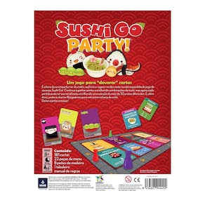 Em "Sushi Go Party!", os jogadores competem para montar a melhor combinação de pratos de sushi em um banquete. Com uma variedade maior de cartas e possibilidades de estratégia em comparação ao jogo original, essa edição traz novas opções que aumentam a rejogabilidade. O jogo inclui diversas cartas de makis, nigiris, sashimis e muito mais, cada uma com diferentes pontuações e habilidades, incentivando os jogadores a planejar bem cada rodada para obter a melhor pontuação.