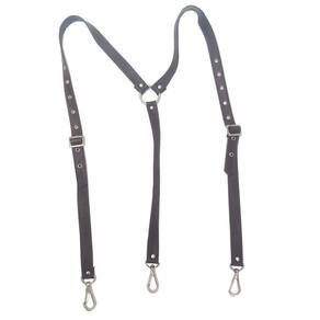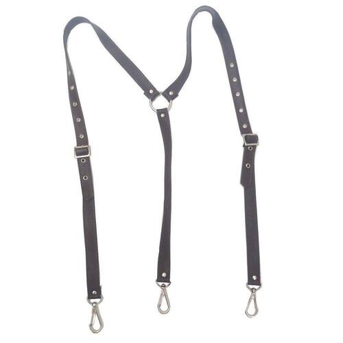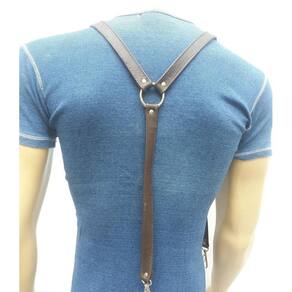 Suspensório de couro legitimo ajustável através de fivelas. A regulagem de tamanho e feita por ilhoses. As tiras são presas em uma argola nas costas, sendo duas na frente e uma atrás, com mosquetões nos passantes da calça. Este produto é indicado para ser usado com calça jeans.