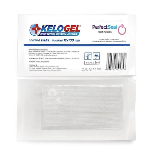 Sutura cutânea ponto falso kelogel strip 12mmx100mm 6un Tamanho: 12mmx100mm Kelogel strip - sutura cutanêa adesiva Composição do produto:Curativo estéril com filamentos poroso de poliésterDescrição de produto:O fechamento de pele com kelogel strip perfectseal é indicado como substituição de outros métodos de fechamento no tratamento de lacerações e incisões cirúrgicas. Também podem ser usados conjuntamente com suturas a linha e grampos, ou após a remoção deles, para maior sustentação.Indicado como substituição de outros métodos de fechamento no tratamento de lacerações cutâneas e incisões cirúrgicas. Também podem ser usados conjuntamente com suturas a linha e grampos, ou após a remoção deles, para maior sustentação.São fabricadas de não tecido poroso, com filamentos para reforço de sua estrutura e com adesivo hipoalergênico.Instruções de uso:1. Limpar e secar a pele.2. Abrir a embalagem e retirar a cartela totalmente.3. Segurar a extremidade da tira e levante-a da cartela.4. Ao usar a tira para suturar a pele, sem pontos ou grampos, juntar as bordas da pele com os dedos ou pinças. Colocar as tiras de um lado ao outro do ferimento, de forma a assegurar uma aplicação sem tensão.5. Em ferimentos maiores, posicionar de forma a distribuir a tensão. Colocar as tiras com aproximadamente 3mm a 5mm de espaço entre elas.6. Podem-se colocar tiras adicionais paralelas a ferida e aproximadamente a 10mm das extremidades das fitas. Isto pode reduzir a força de cisalhamento a que a ferida está submetida.Instruções de uso:Todos os produtos adesivos aplicados sobre a pele, uma pequena porcentagem da população pode apresentar irritação na pele ou injúria durante o uso ou na remoção.Não aplicar as tiras adesivas sob tensão, pele danificada com bolhas e falta de adesão podem ocorrer se for verificado tensão excessiva.O uso com outros produtos adesivos pode causar bolha e injúria na pele.Advertência:Para reduzir o risco de infecção não reutilize as tiras e descarte as tiras não utilizadas. Na ocorrência de alguma reação e/ou alteração na pele, descontinue o uso e observe. Caso persista algum sinal/sintoma, consulte um profissional de saúde. Nos casos em que haja o acompanhamento de um profissional de saúde, siga a orientação previamente fornecidaBolsa:Contém: 1 bolsa 6 tiras por bolsaTamanho: 12mm x 100mm registro anvisa 81926099008