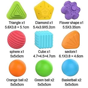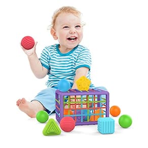 Os bebês empurram blocos e bolas de diferentes formas para dentro da lixeira ou os retiram através de elásticos, um a um, para fazê-los praticar, explorar e desenvolver movimentos finos das mãos.