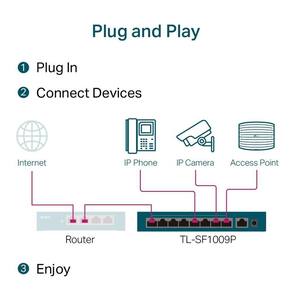 Switch Profissional com 9 portas sendo 8 portas PoE+ (Budget de 65 W) para Inúmeras Aplicações A conformidade com o padrão 802.3af/at PoE+ suporta até 30 W em cada porta PoE. O orçamento de energia PoE total de 65 W para as 8 portas PoE+ abrem uma ampla gama de aplicações, como vigilância para escritórios, dormitórios e pequenas empresas. É totalmente compatível com câmeras IP, access points, telefones IP, computadores, impressoras e muito mais.