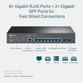 Interface: 8 Portas RJ45 de 10/100/1000 Mbps 2 Slots SFP Gigabit 1 Porta de Console RJ45 1 Porta de Console Micro-USB
