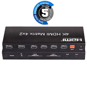Switch Hdmi 4x2 Controle - 2k, 4k, 3d E Full Hd - Kit Com 5 O Switch Matrix 4x2 distribui a informação de até quatro dispositivos eletrônicos compatíveis com o protocolo de transmissão HDMI em pelo menos dois terminais de exibição. Aparelho possui saída independente para cabo de fibra ótica e fone de ouvido estéreo. Este Splitter multiplicador de sinal, auxilia em diversas atividades: exibições em eventos corporativos, reuniões empresarias, ambientes escolares, salas de conferências e treinamentos educacionais ou empresariais. Conecte quatro fontes de sinal HDMI Full HD em televisores, projetores ou telas de exibição. Compatível com desktop, laptop, de TV digital, DVD, home theater, blueRay videogame e outros aparelhos. Vem com controle remoto para selecionar os aparelhos com comodidade. Utilize o IR intuitivo para alternar livremente a fonte do sinal. INFORMAÇÕES: Suporta HDMI 1.4b, HDCP 2.2 Suporta formato de vídeo 3D Suporta a mais alta resolução até 3840x2160 / 30Hz Suporta 3,4 Gbps e até 340Mhz Suporta cor profunda 8/10/12 bit Suporta LPCM / Dolboy / DTS 5.1 canais CONTEÚDO: 1x Matrix HDMI 4x2 1x Controle 1x Fonte Bivolt 1 manual Homologação Anatel: 060792000160 Marca: Não Informado