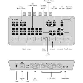 O switcher Blackmagic Atem SDI foi projetado para transmissão ao vivo multicâmera para aplicativos de internet ou broadcast. O Atem SDI fornece consoles de jogos, transmissões de computador corporativo ou câmeras HD com um switcher de produção ao vivo de quatro entradas com um painel de controle integrado. Quatro entradas SDI estão disponíveis na parte traseira do chassi e suportam vídeo de até 1080p60. Duas saídas 3G-SDI são úteis para um projetor ou monitor externo, uma saída USB Type-C para streaming de vídeo de até 1080p60 para um computador e uma porta Ethernet 10/100 RJ45 para gerenciamento do sistema, controle remoto e atualizações.