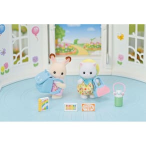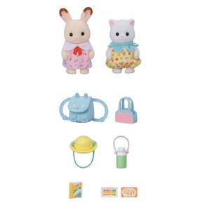 Este conjunto vem com acessórios como mochila, chapéu e garrafa de água – tudo de que bebês precisam para a caminhada até o jardim de infância. Os bebês estão usando roupas lindas e coloridas. Os bebês podem usar e segurar a mochila, a bolsa, a garrafa de água e o chapéu. Os gizes de cera e o livro de desenho podem ser colocados dentro da mochila ou bolsa. O bebê Coelho Chocolate se chama Crème e o bebê Gato Persa se chama Ryan.