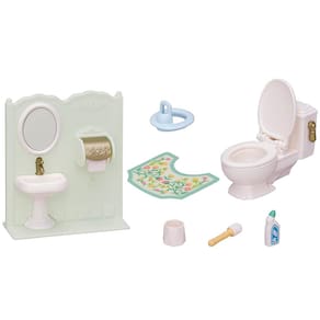 O Conjunto de Toalete vem com vaso sanitário, pia, produtos de limpeza, penico e tapetinho. É possível acionar a descarga puxando a alavanca do vaso sanitário e o papel higiênico pode ser desenrolado. Os bonecos podem sentar no vaso sanitário. O assento do penico pode ser acoplado ao vaso sanitário para treinar os bebês para usá-lo. A pia inclui espelho, cuba e porta-papel higiênico. Há até um espaço para guardar o penico. Você pode usar o limpador e a escova para limpar o vaso sanitário. Combine com bonecos, casas e móveis (vendidos separadamente) para ainda mais diversão.