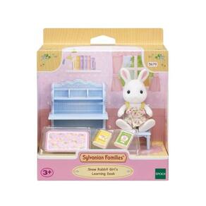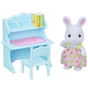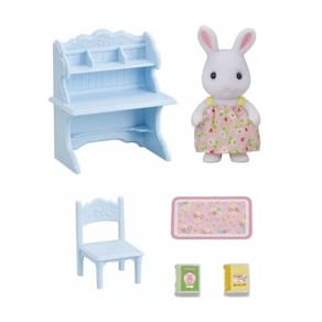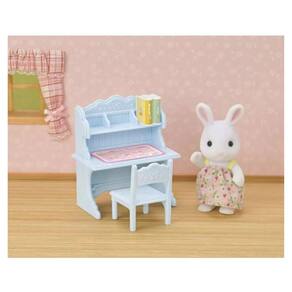 Conjunto Escrivaninha Menina Coelho Neve, vem com uma escrivaninha e diversos acessórios de estudo. Inclui uma escrivaninha azul com espaço para um tapete de mesa e prateleiras para livros. Os braços, pernas e cabeças dos bonecos podem ser movidos e colocados em diferentes posições.