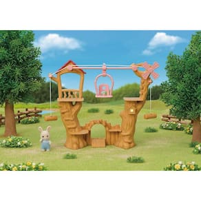 O Parquinho nas Árvores do Bebê tem uma gondola que comporta um bebê. Puxe a corda para mover a gondola para esquerda e para direita. Tem um parquinho de aventuras embaixo das árvores, combine com o Cabana no Lago.