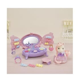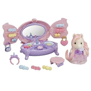 O conjunto penteadeira da pônei é um conjunto de acessórios para cabelo que inclui a menina pônei com um espelho compacto e acessórios para cabelo. O espelho compacto pode ser aberto para se transformar em uma penteadeira com um espelho e prateleiras. Os acessórios incluídos podem ser guardados dentro da penteadeira. O pedaço de fita no meio do espelho compacto pode ser utilizado como um banquinho para a cômoda. A penteadeira também pode ser utilizada para que se exiba acessórios. Apresentando a menina pônei de cabelo rosa, joy. Combine com o salão de beleza elegante - ponei ou com o conjunto cabeleireiro da pônei ambos vendidos separadamente para uma brincadeira ainda mais imaginativa