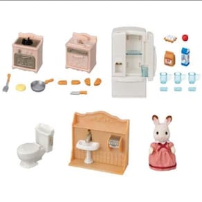 Sylvanian Families Conjunto Primeiros Moveis - Epoch Conjunto primeiros móveis é perfeito para enfeitar casas da Sylvanian Families. Conjunto apresenta várias articulações do móveis, simulando características de cada item. Geladeira abre as portas, você pode tirar cubos de gelo, fogão simula o acendimento do fogo, privada simula a descarga, torneira simula agua saindo, torta pode ser partida em pedaços. Um conjunto fenomenal!