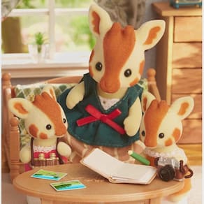 A Família das Girafas são figuras encantadoras com pescoços longos e pelagem distinta. O conjunto contém quatro figuras: pai Egbert, mãe Olive, e os bebês Bran e Brie. Inclui uma câmera e um par de binóculos para os bebês. Os braços e pernas das figuras podem ser movidos para colocá-los em diferentes poses. Pai Girafa Egbert continua esquecendo sua altura, então ele está sempre batendo com a cabeça nas coisas. A mãe Olive é muito otimista. Bran, o bebê em laranja, adora tirar fotos com a câmera que seu pai lhe deu. Ele realmente admira o seu pai alto, de mais de uma maneira Brie, de vermelho, gosta de usar os binóculos que seu pai lhe deu. Ela está sempre implorando à mãe que a deixe montar na cabeça para poder ver mais longe e mais longe. Combine com outras casas e móveis (vendidos separadamente) para uma brincadeira ainda mais divertida e imaginativa