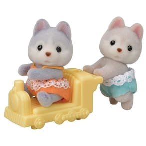 Gêmeos Huskys contém figuras de bebê Amber (Sentado) e Jeremy (Gatinha), juntamente com um carrinho de passeio (Trem). ·A figura sentada tem pêlo cinza, e a figura em pé tem pêlo castanho. ·Os gêmeos Husky (sentado e em pé) podem andar no carrinho de passeio. ·As cabeças das figuras possuem movimentos