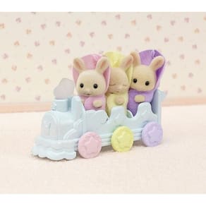 Conjunto de três bebês recém-nascidos trigêmeos de coelho com banho de bebê e trem de brinquedo. Os trigêmeos são os recém-chegados à família dos coelhos de leite. Sendo tão jovens, eles ainda não são capazes de fazer muita coisa sozinhos, mas isso não é problema, pois seus pais amorosos e irmãos e irmãs mais velhos sempre querem jogar com eles ou levá-los no carrinho de bebê.