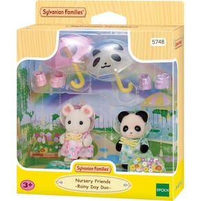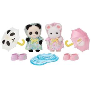 O conjunto Amigos do Jardim da Infância Caminhando na Chuva é a adição perfeita a qualquer conjunto de jardim de infância Vem com dois bebês. Este conjunto vem com guarda-chuvas fofos, galochas e até uma poça perfeito para brincar em dias de chuva. Os guarda-chuvas encaixam nas mãos dos bebês. Os bebês estão usando capas de chuva com uma estampa fofa de nuvens. Os bebês também podem usar as galochas. O bebê Rato Marshmallow se chama Albert e a bebê Panda Graciosa se chama Angela.