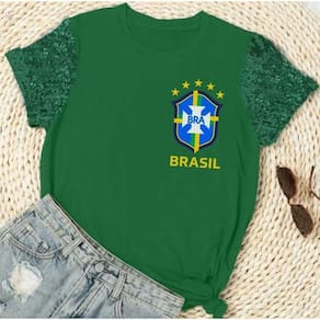 T-SHIRT FEMININA BRASIL MANGA PAETE - ESCUDO