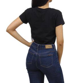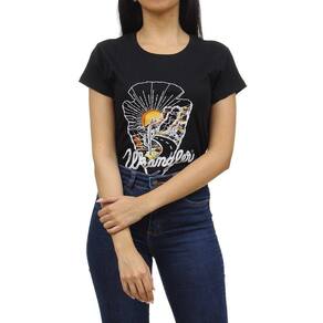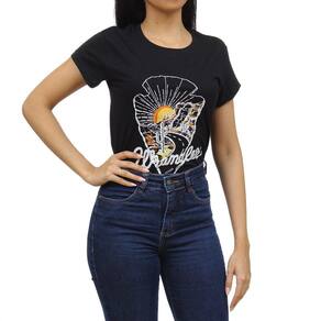 Uma T-Shirt(Camiseta) feminina para aquelas fans da Wrangler apaixonadas na marca, esta peça é fabricada em tecido 100% Algodão na cor Preto, possuindo mangas bem curtas, uma gola tradicional e estampa grande no peito. Uma camiseta cheia de personalidade, cheia de estilo e ao mesmo tempo versátil, que com certeza falta em seu guarda roupa!
