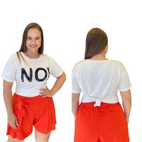 T-Shirt Plus Size em Viscolycra. Modelo com decote redondo e manga curta.Possui aplicação frontal bordado de paetê com escrita “no!”.