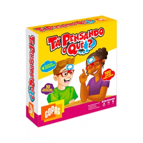 Coloque os óculos, pegue sua carta e faça as perguntas certas! Tá Pensando o Quê? É um jogo de criatividade e de muita diversão, onde cada jogador deve adivinhar a imagem que está em sua carta. Use a imaginação para fazer as perguntas mais inusitadas aos outros jogadores.