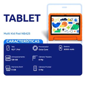 Se voce esta buscando uma solucao tecnologica para entreter e educar seu filho, o Tablet Multi Kid Pad NB425 e o dispositivo ideal. Muitos pais se preocupam com a seguranca e durabilidade dos eletronicos nas maos das criancas, alem de desejarem um aparelho que ofereca um bom desempenho e conectividade para atividades educativas e recreativas. O Kid Pad nao so atende a essas necessidades, como tambem oferece recursos modernos, como tela ampla, grande capacidade de armazenamento e funcionalidades de seguranca, garantindo uma experiencia divertida e segura para os pequenos. Confira mais detalhes: