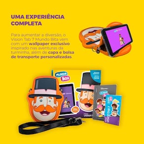 Além disso, o tablet inclui duas capas protetoras, uma de silicone e outra de neoprene, para maior resistência a quedas, e uma bolsa com suporte de bancada para maior praticidade durante o uso. Com capacidade de armazenamento expansível, bateria de longa duração de 3100mAh e recursos adicionais como câmera frontal, Wi-Fi e Bluetooth, o Vision Tab 7 Mundo Bita oferece tudo que as crianças precisam para se divertir e aprender com segurança e praticidade.