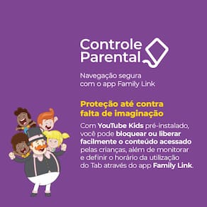 Diferenciais e Destaques: Processador Octa Core e 3GB de RAM para uma navegação ágil e sem interrupções Tela de 7 polegadas IPS com tecnologia full lamination para cores vibrantes Controle parental completo para segurança online das crianças YouTube Kids pré-instalado para monitoramento fácil de conteúdo Duas capas protetoras inclusas: silicone e neoprene, resistentes a quedas Bolsa de transporte com suporte de bancada para praticidade Bateria de 3100mAh para uso prolongado sem recargas frequentes Armazenamento expansível para mais aplicativos, jogos e vídeos