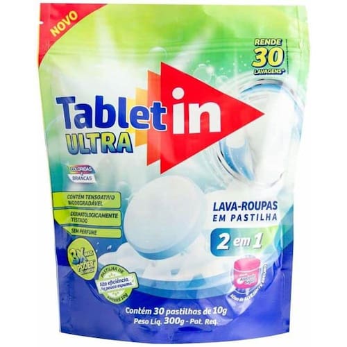 Tablet in Lava-Roupas em pastilha 2 em 1 - 1 caixa c/ 30 pastilhasTABLET IN é uma mistura perfeita de detergentes inôrganicos testados dermatologicamente, com um poderoso alvejante seguro de última geração. Essa mistura oferece um alto poder de limpeza. Antialérgico Sem perfume 1 pastilha lava até 16kg Contém alvejante seguro e ideal para roupas brancas ou coloridasDose única - Sem desperdício - Antialérgico - Sem perfume - Faz pouca espuma - Não contém fosfatos - Não causa irritação ANVISA 25351091607201879 VAL 24 MESES A PARTIR DA DATA DE FABRICAÇÃO