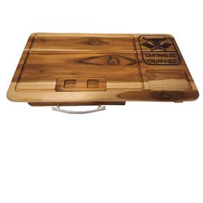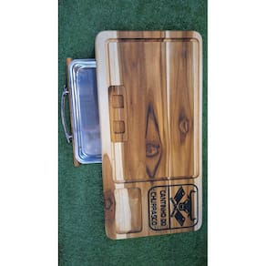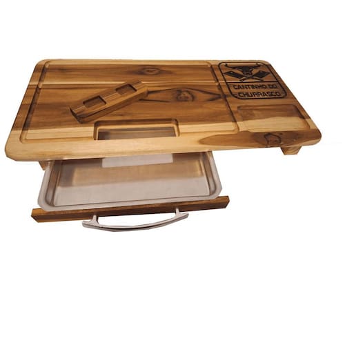 Tábua de carne com gaveta feita em madeira naval teca Otimma resistencia Desenhos em alto relevo usinados e pintados Acabamento em óleo vegetal Lixada Tábua acompanha uma assadeira número 1 baixa em alumínio e uma tampa para o recipiente de carne, também um recorte para encaixar a latinha de cerveja da sua marca preferida. : Ótimo presente para quem adora um churrasco. As cores podem sofrer variações em relação a foto por conta da madeira. Medidas: 60x30x7cm Marca: Não Informado