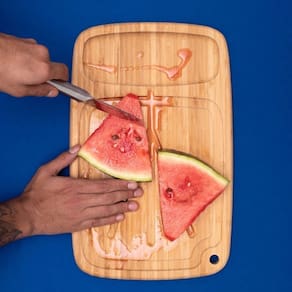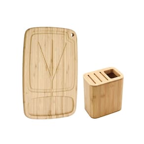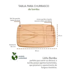 Tabua de bambu para churrasco. A tabua com vinco é pratica e versatil, pode ser usada para cortar carnes, legumes, paes e muito mais. Os vincos sao canaletas para evitar que os liquidos escorram, deixando a bancada sempre limpa. Facil de guardar, possui furo na borda para pendurar. O porta utensilios é pratico e possui espaço para facas, colheres, espatulas entre outros. Produzida em bambu, material resistente e ecologicamente correto. Duravel e higienico, o bambu é resistente e tem propriedades que evitam a proliferaçao de bacterias. Perfeito para deixar sua bancada ainda mais bonita. Contem: 1 Porta Utensilios Medidas: 15 x 16,6 x 10 cm 1 Tabua com Vinco Medidas: 40 x 25 x 2 cm Material: Bambu