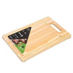 Feita em madeira Pinus, ela tem um formato retangular clássico, canaleta para escorrer a gordura e alça, facilitando o manuseio e evitando bagunça na hora de cortar a carne.