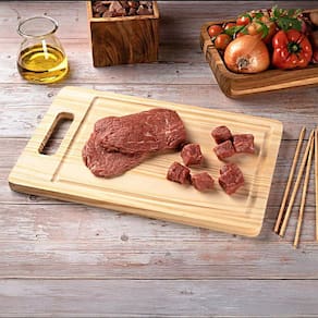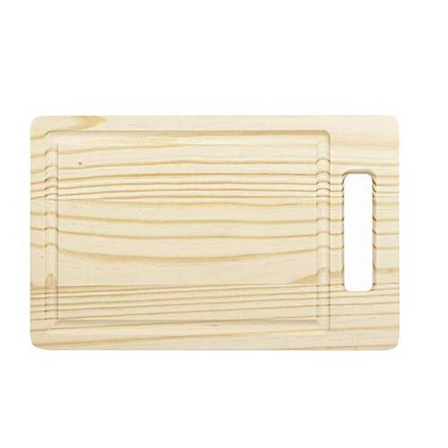 - Material: Madeira Pinus de qualidade - Formato: Retangular padrão - Canaleta: Ideal pra escorrer líquidos e gordura - Alça/Pegador: Mais firmeza e segurança ao manusear - Uso: Corte de carnes, legumes, pães e mais - Perfeita para o dia a dia na cozinha ou aquele churrasco com os amigos. Simples, funcional e com ótimo custo-benefício