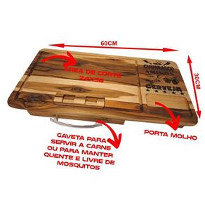Tabua de churrasco com gaveta churrasco amigos e muita cerveja Tábua de carne com gaveta feita em madeira naval teca Otima resistencia Desenhos em alto relevo usinados e pintados Acabamento em óleo vegetal Lixada Tábua acompanha uma assadeira número 1 baixa em alumínio e uma tampa para o recipiente de carne, também um recorte para encaixar a latinha de cerveja da sua marca preferida. : Ótimo presente para quem adora um churrasco. As cores podem sofrer variações em relação a foto por conta da madeira. Medidas: 60x30x7cm Marca: Não Informado