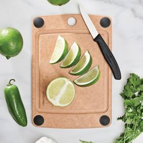 - Tábua de corte de 25,4 x 17,78 cm com pés antiderrapantes e sulco de suco natural; pés de silicone preto